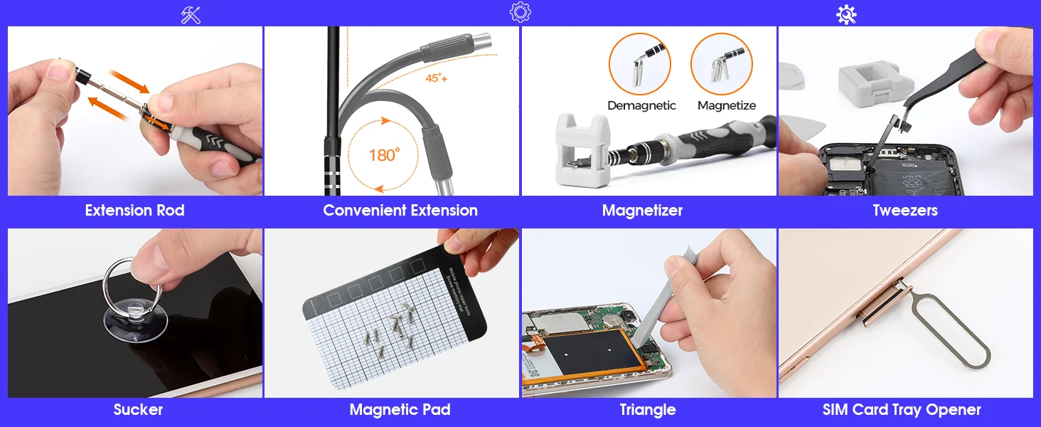 Das einzigartige magnetische Design verhindert, dass winzige Schrauben auseinander fallen, was Ihre Demontage-und Montage arbeit effizienter macht. Magnetische und ent magneti sie rende Funktionen, um Ihre verschiedenen komplexen Bedürfnisse zu erfüllen. Ausgestattet mit anti statischen Pinzetten und Silikon griffen, eignet es sich für verschiedene Anlässe und macht Ihre Arbeit bequemer.